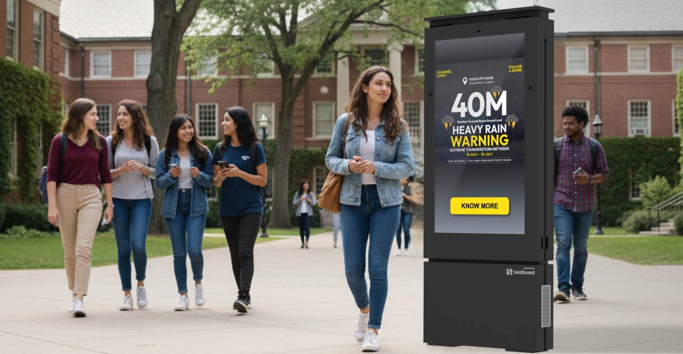 - Physical Presence: screens placed in dining halls, libraries, dorm entrances, and main quads capture real-world attention.