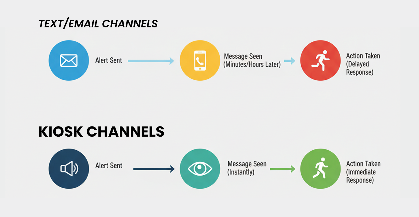 - Visual Confirmation: Kiosks and signage auto-switch to alert mode.