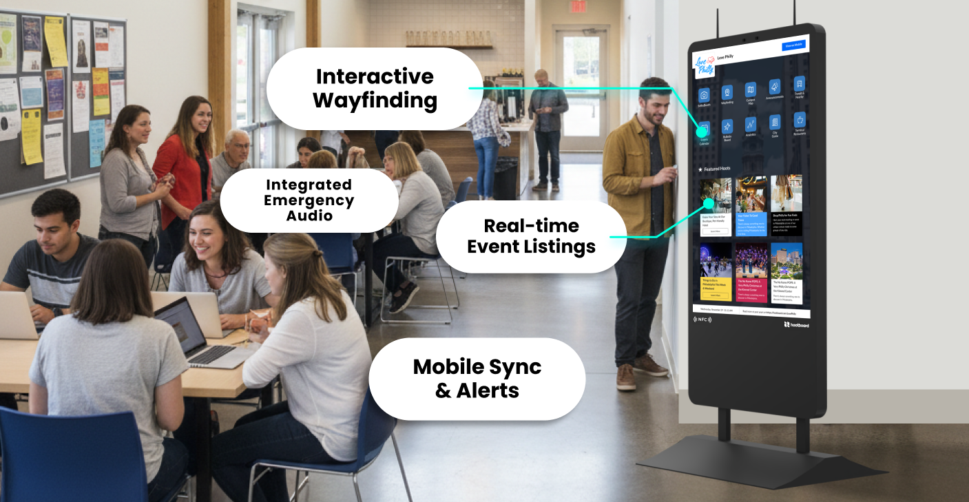 - Instant Override: alerts push to every kiosk simultaneously, creating synchronized visibility across campus.