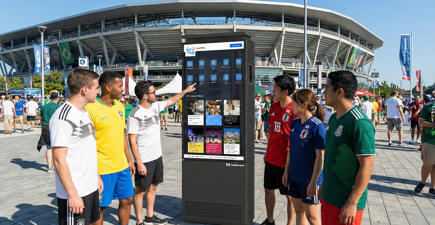A fan from Germany attending a match in Philadelphia has a three-hour window locked in, but the other 21 hours of that day—and potentially 2-4 surrounding days—are wide open. They didn’t arrive with restaurant reservations, museum tickets, or shopping plans. They’re making those decisions in-market, in real-time, in locations of opportunity. Interactive tourism kiosks positioned at stadiums, hotels, transit hubs, and downtown corridors become the default information source.